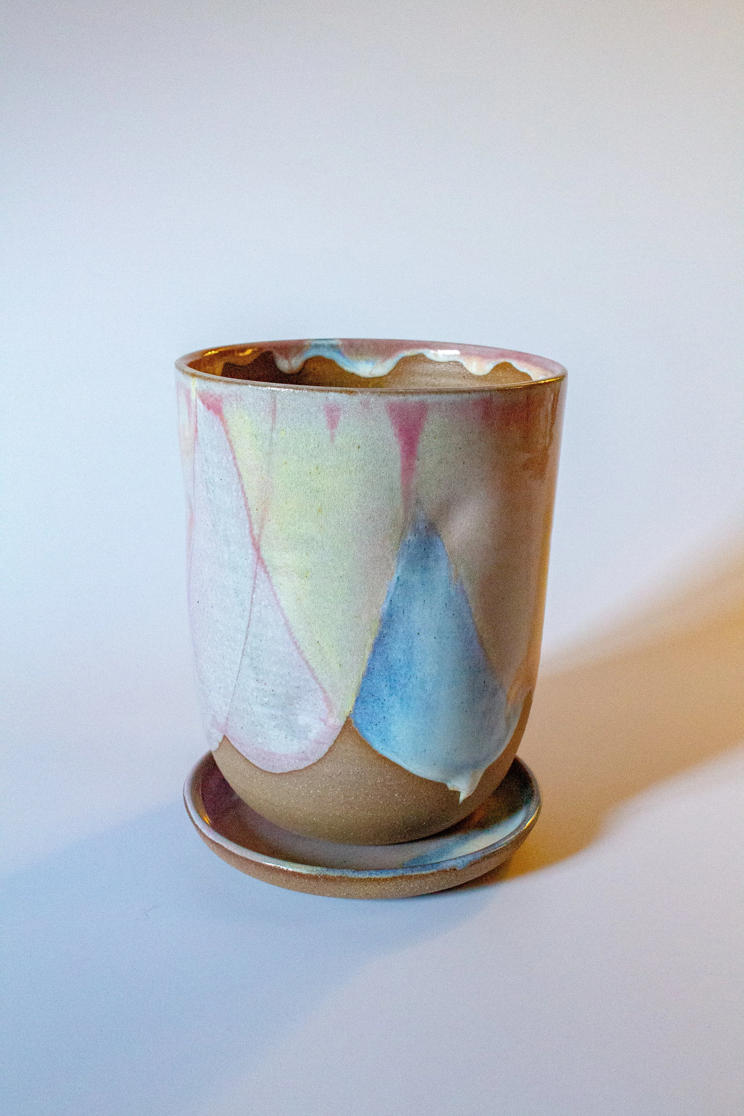 Give your plants a stylish home with this handmade ceramic plant pot. Available in a range of playful handmade glaze colours, each pot is wheel-thrown and subtly altered with imprinted dimples that add charm and individuality. Includes a drainage hole and matching saucer for healthy roots and easy care. No two are exactly alike — perfect for adding character to any space.